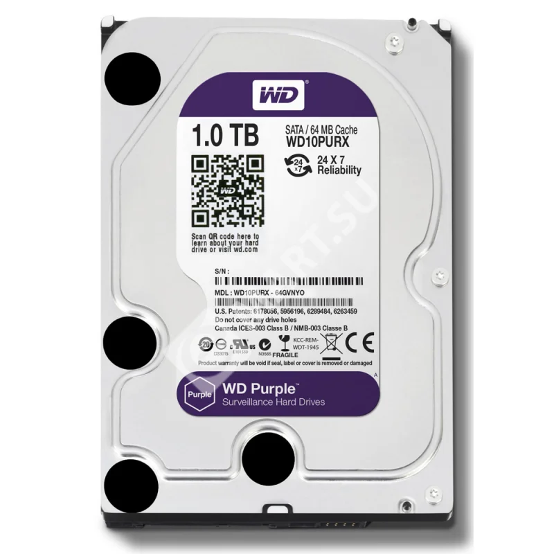 Western Digital WD10PURZ - Модель принадлежит к специализированной серии WD Purple, предназначенной для систем видеонаблюдения и рассчитанной на рабочую нагрузку до 180ТБ в год, что превышает в несколько раз показатели жестких дисков для настольных компьютеров. Количество камер на накопитель – до 64, в системе может быть задействовано до 8 дисков. Объем HDD составляет 1 ТБ, форм-фактор – 3.5 дюйма, интерфейс – SATA 6 Гб/с, скорость вращения шпинделя – 5400 об/мин. На «борту» присутствует технология AllFrame 4K, позволяющая снизить потерю кадров, улучшить воспроизведение и увеличить количество дисковых отсеков, поддерживаемых видеорегистратором. Модель имеет умеренные показатели энергопотребления – 3.3 Вт при максимальной загрузке (чтение/запись). Такой результат во многом достигается благодаря технологии IntelliSeek – автоматическое вычисление оптимальной скорости подвода головки, что не только понижает потребление энергии, но и сводит к минимуму шум и вибрацию. Габаритные размеры устройства 101.6x26.1x147 мм, вес – 450 грамм.