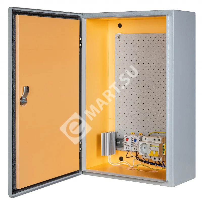 утеплитель из пенополистирола толщиной 20 мм, замок 1 шт, ключ 1 шт, монтажная плата 1шт, гермовводы 2шт, розетка 1 шт, автоматический выключатель 1шт, термореле 1шт., реле предстарта 1 шт., нагреватель мощностью в 50 Вт 1шт.