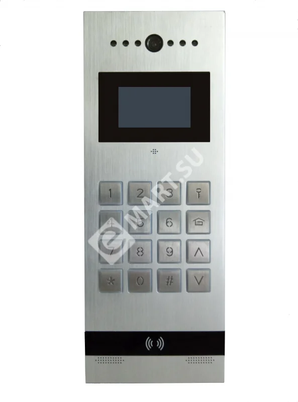 Вызывная панель цветного многоквартирного домофона со встроенным считывателем карт Mifare (чтение UID). Прочный алюминиевый корпус. Анимированный TFT дисплей. Простое подключение с помощью разъемов RJ-45 (подключение по стандарту T568B). Управление замком. Подключение датчика положения двери. Выход Wiegand-26 для подключения к стороннему контроллеру СКУД.