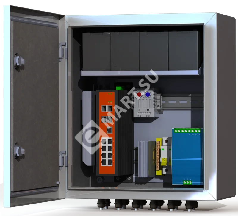 Двухполюсный защитный автомат 6А - 1 шт.Обогреватель 50Вт - 1 шт. Сдвоенный термостат - 1 шт. Блок бесперебойного питания 300Вт -1 шт. Аккумулятор 12В, 7А/ч - 4 шт. Промышленный управляемый коммутатор 8*PoE 802.3 af/at (бюджет 240 Вт), 4*SFP, 1*console port - 1 шт. Оптический кросс 4 порта SC/SM - 1 шт. Гермовводы 8*PG9, 4*PG13,5 -1 комплект.