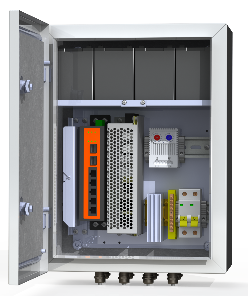 Двухполюсный защитный автомат 6А - 1 шт. Обогреватель 50Вт - 1 шт. Сдвоенный термостат - 1 шт. Блок бесперебойного питания 155Вт -1 шт. Аккумулятор 12В, 7А/ч - 4 шт. Промышленный управляемый коммутатор 4*PoE 802.3 af/at (бюджет 140 Вт), 2*SFP, 1*console port - 1 шт. Оптический кросс 4 порта SC/SM - 1 шт. Гермовводы 4*PG9, 4*PG13,5 -1 комплект.
