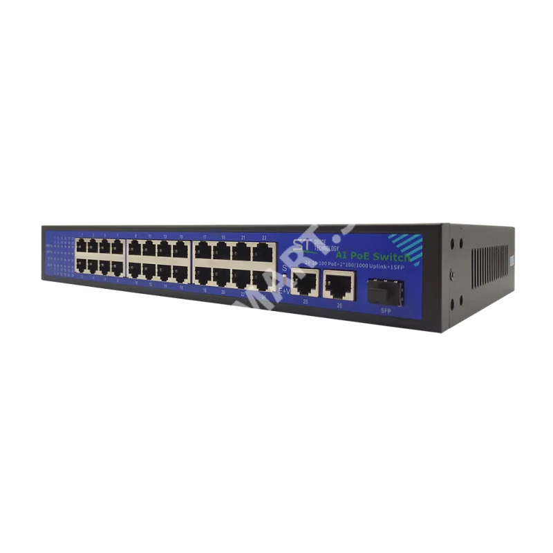 Источник питания ST-S244POE, (2G/1S/340W/A) PRO, Switch POE 24-х портовый для обеспечения проводных сетей напряжением 48В , защита от КЗ, Extend 250м., AI PoE, AI QoS, VLAN, Грозозащита, PoE порты: 24 х (10/100 Мбит/с), UpLink порты: 2 х(10/100/1000 Мбит/с), SFP порты: 1 х (10/100/1000 Мбит/с), Max.пропускная сп-ть: 100 Мбит/канал (PoE порты),1000Мбит/канал (UpLink порты), Uвых: 48 (±10%), Р(ном) каждый порт (Вт): 14 Вт, Р(макс) каждый порт (Вт): 30 Вт, Р(сумм) общая (Вт): 340 Вт, Тип РоЕ: А, Коммутационная способность (Гбит/с): 12,8 Гбит/с, AI PoE(watchdog), VLAN, Extend, Qos, Система охлаждения: пассивная, Металл, Температура эксплуатации: От -45°C до +55°C, Габаритные размеры ИП: 310х182х45 мм