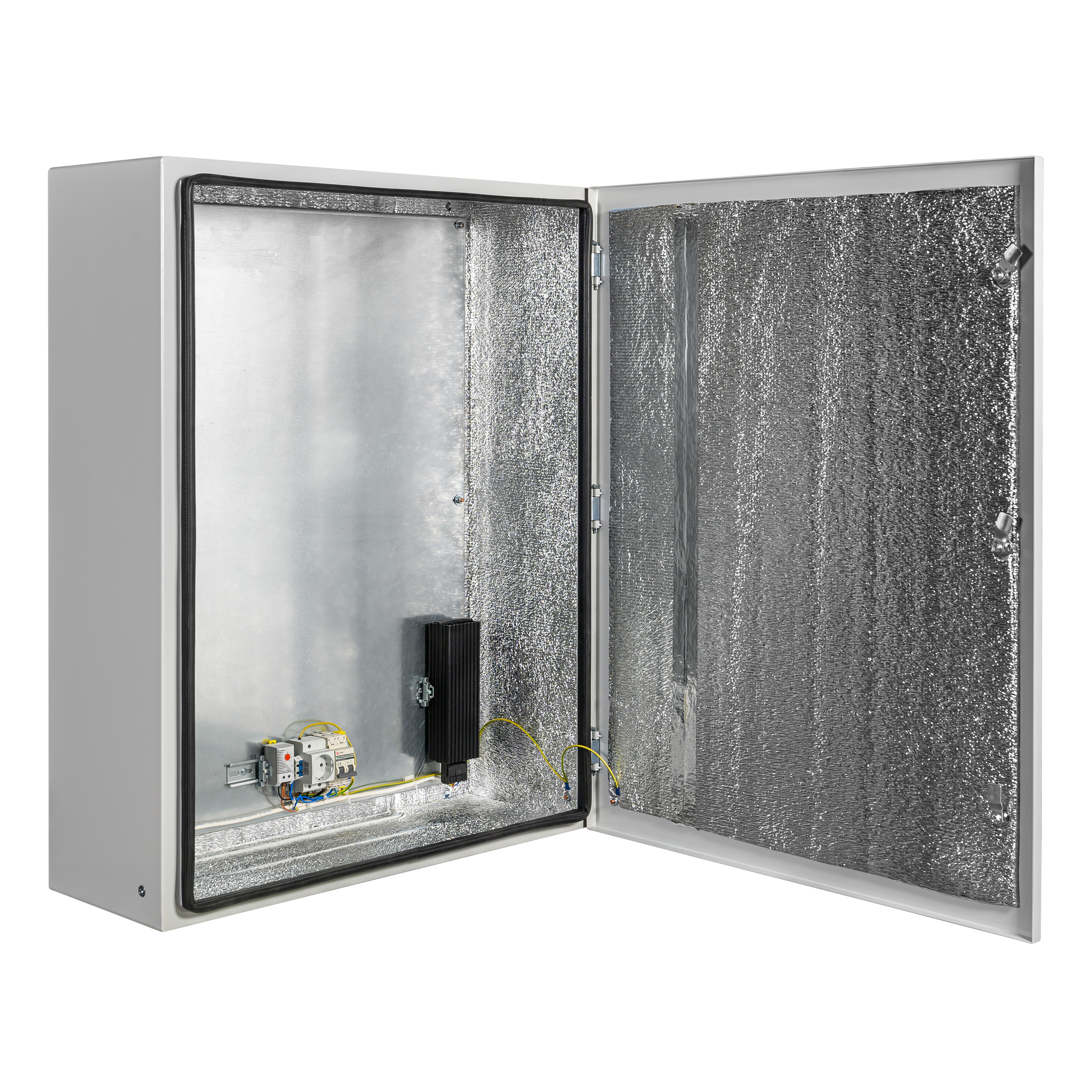 утеплитель из порилекса, замок 2 шт, ключ 1 шт, монтажная плата 1шт, гермовводы 5 шт (MG-25), розетка 1 шт, автоматический выключатель, 6А 1шт, клемма для подключения оборудования 2 шт, клемма заземления 1 шт, термореле 1шт, нагреватель мощностью 150 Вт 2 шт.