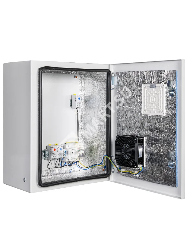 утеплитель из порилекса, замок 2 шт,ключ 1 шт, монтажная плата 1шт, гермовводы 2 шт (MG-25), розетка 1 шт, автоматический выключатель, 6А 1шт, клемма для подключения оборудования 2 шт, клемма заземления 1 шт, термореле 1шт, реле предстарта 1 шт, вентиляционная решётка с фильтром 1 шт, вентилятор с решёткой и фильтром 1 шт, нагреватель мощностью 75 Вт 1шт.