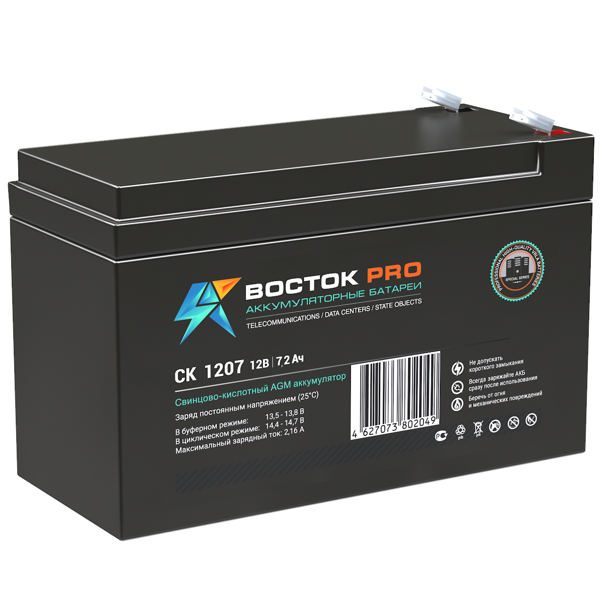 Свинцово-кислотные аккумуляторы ВОСТОК серии CK предназначены для использования в системах бесперебойного питания, резервного энергоснабжения, автономных энергосистемах. Изготовлены по AGM технологии (электролит, абсорбированный в стекловолоконном сепараторе), являются герметизированными и необслуживаемыми, со сроком службы в буферном режиме 10 лет (от 5 до 26 Ач – 5 лет). Обладают высокими разрядными и эксплуатационными характеристиками благодаря использованию в составе электролита и намазной пасты специальных добавок, препятствующих коррозии и замедляющих процесс старения.
