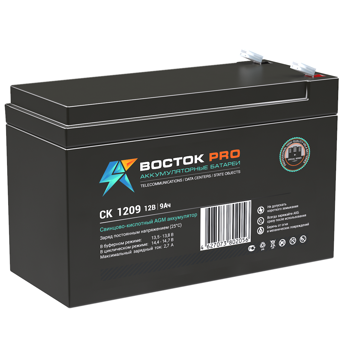 Свинцово-кислотные аккумуляторы ВОСТОК серии CK предназначены для использования в системах бесперебойного питания, резервного энергоснабжения, автономных энергосистемах. Изготовлены по AGM технологии (электролит, абсорбированный в стекловолоконном сепараторе), являются герметизированными и необслуживаемыми, со сроком службы в буферном режиме 10 лет (от 5 до 26 Ач – 5 лет). Обладают высокими разрядными и эксплуатационными характеристиками благодаря использованию в составе электролита и намазной пасты специальных добавок, препятствующих коррозии и замедляющих процесс старения.