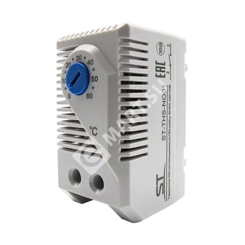 Термостат ST-THS-NO01 нормально-открытый (вентилятор) механический предназначен для поддержания фиксированной температуры и предотвращения образования конденсата, коррозии в корпусных изделиях, клеммных коробках. Нормально-открытый контакт (NO) – для регулирования вентиляторов, или для включения сигнальных датчиков при превышении температуры., Номинальное напряжение, В: 220, Номинальный ток контактов: 110В: 15А, Чувствительный элемент: биметаллический элемент, Диапазон регулировки температуры: от 0 °С до +60 °С, Срабатывание при отклонении от установленной °t: 5°С (± 4 °С погрешность), Тип контакта: NO, Тип крепления: на DIN-рейку 35мм, Степень защиты: IP20, Рабочая температура: -20°С - +80°С, Материал корпуса: пластик, Цвет корпуса: светло-серый, Габариты изделия, мм: 60х33х43, Комплектация: термостат, паспорт, упаковочная тара