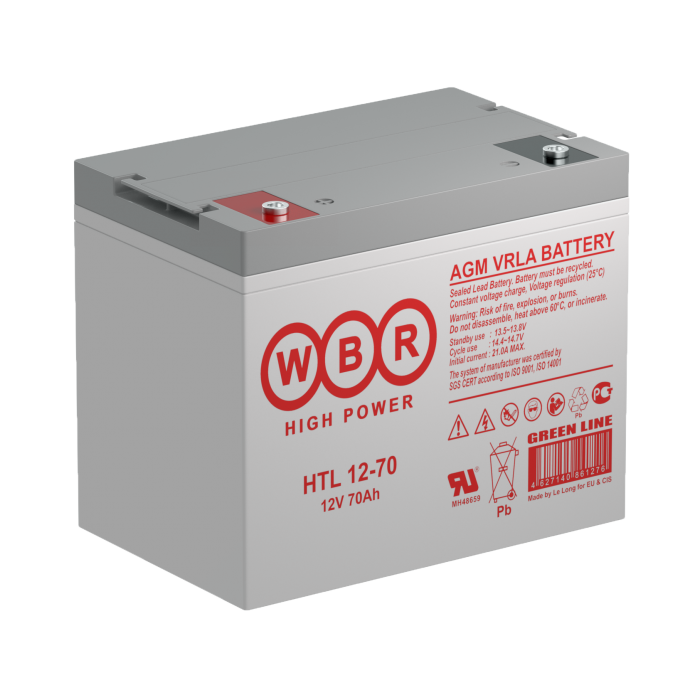 Аккумуляторы WBR серии HTL12-70 - герметизированные, выполненные по технологии AGM, свинцово-кислотные аккумуляторные батареи общего применения с увеличенным до 15 лет сроком службы в буферном режиме при 20 °С. Эти высокоэффективные перезаряжаемые батареи не требуют обслуживания в течение всего срока службы. Основные области применения: источники бесперебойного питания (UPS), оборудование систем телекоммуникации и электроэнергетики, аварийное освещение, освещение пешеходных переходов и светофоры на солнечных батареях, системы «умного дома» для жарких регионов, в которых оборудование работает при высоких температурах.