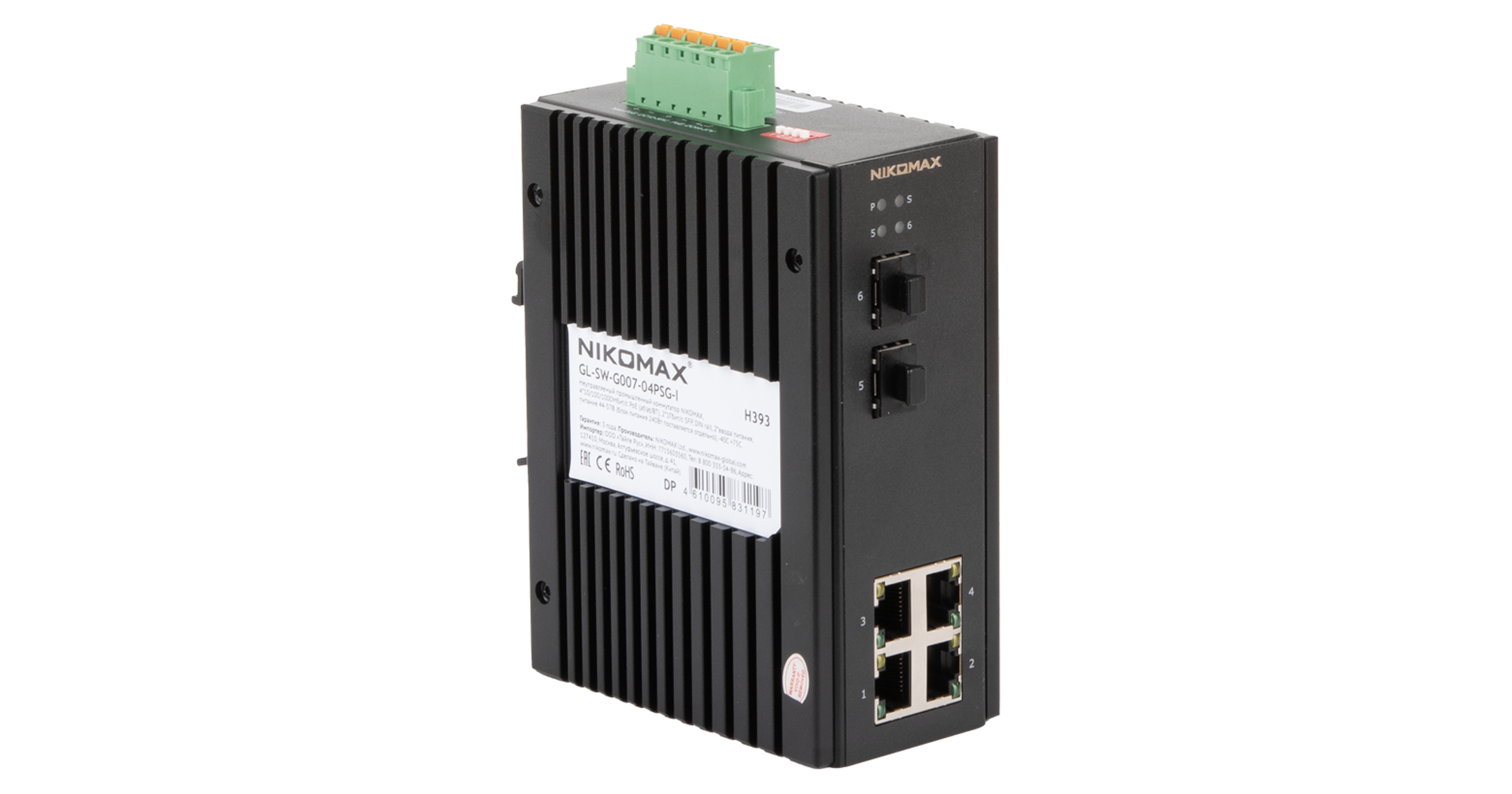 Неуправляемый промышленный коммутатор NIKOMAX, 4*10/100/1000Мбит/с PoE (af/at/BT), 2*1Гбит/с SFP, крепление на DIN-рейку, 2*ввода питания, питание 44-57В (блок питания 240Вт поставляется отдельно), -40С +75С.