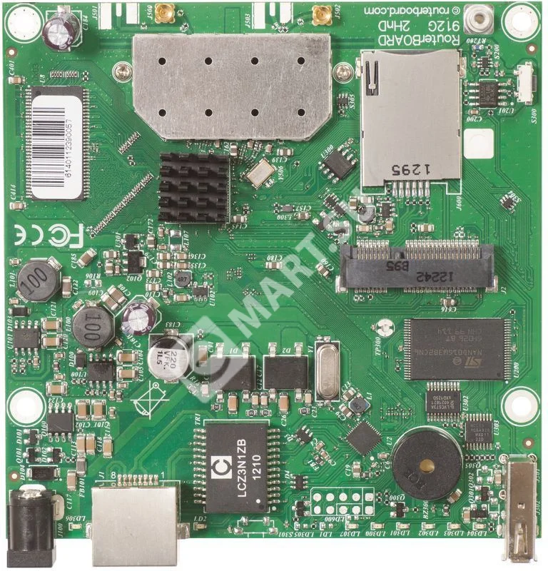 Mikrotik RB912-UAG-2HPnD - материнская плата с одним Gigabit Ethernet портом и встроенной радиокартой на 2.4 ГГц. Устройство представляет собой маленький беспроводной роутер, гигабитный сетевой порт позволяет использовать весь потенциал стандарта 802.11n. По сравнению с платами 911ой серии имеется разъём расширения miniPCIe и вдвое увеличенный объём ОЗУ, а также повышенный уровень лицензии ОС.