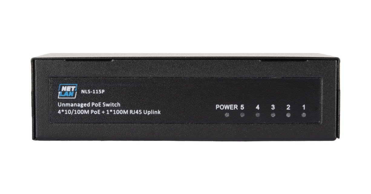 Коммутатор NETLAN, неуправляемый, 4*10/100Мбит/с PoE (af/at), 1*100Мбит/с RJ45, 1* DC52V/0.92A, PoE бюджет 48W
