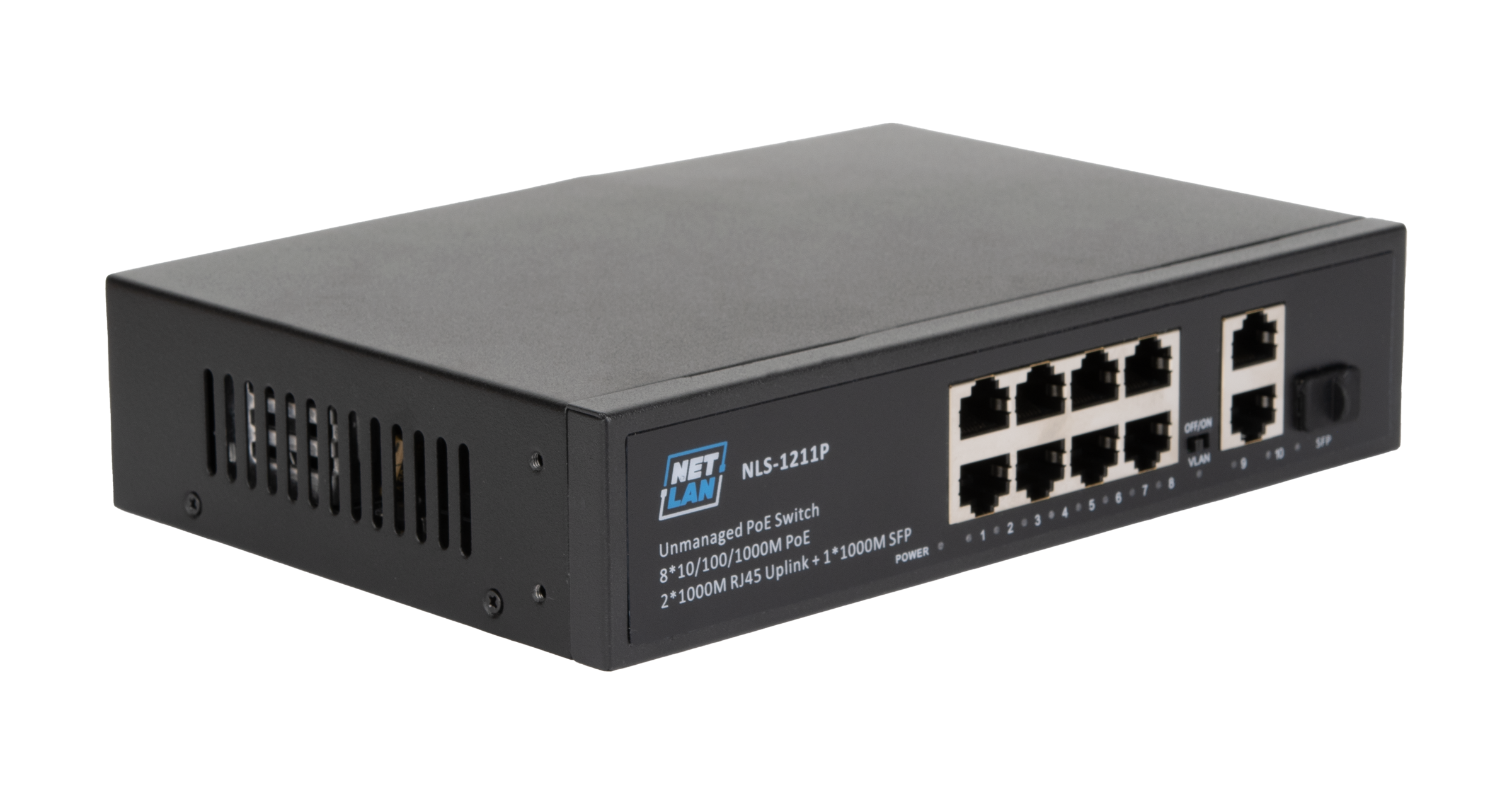 Коммутатор NETLAN, неуправляемый, 8*10/100/1000Мбит/с PoE (af/at), 2*10/100/1000Мбит/с RJ45, 1*100/1000Мбит/с SFP, DC52V/2.3A, PoE бюджет 120W